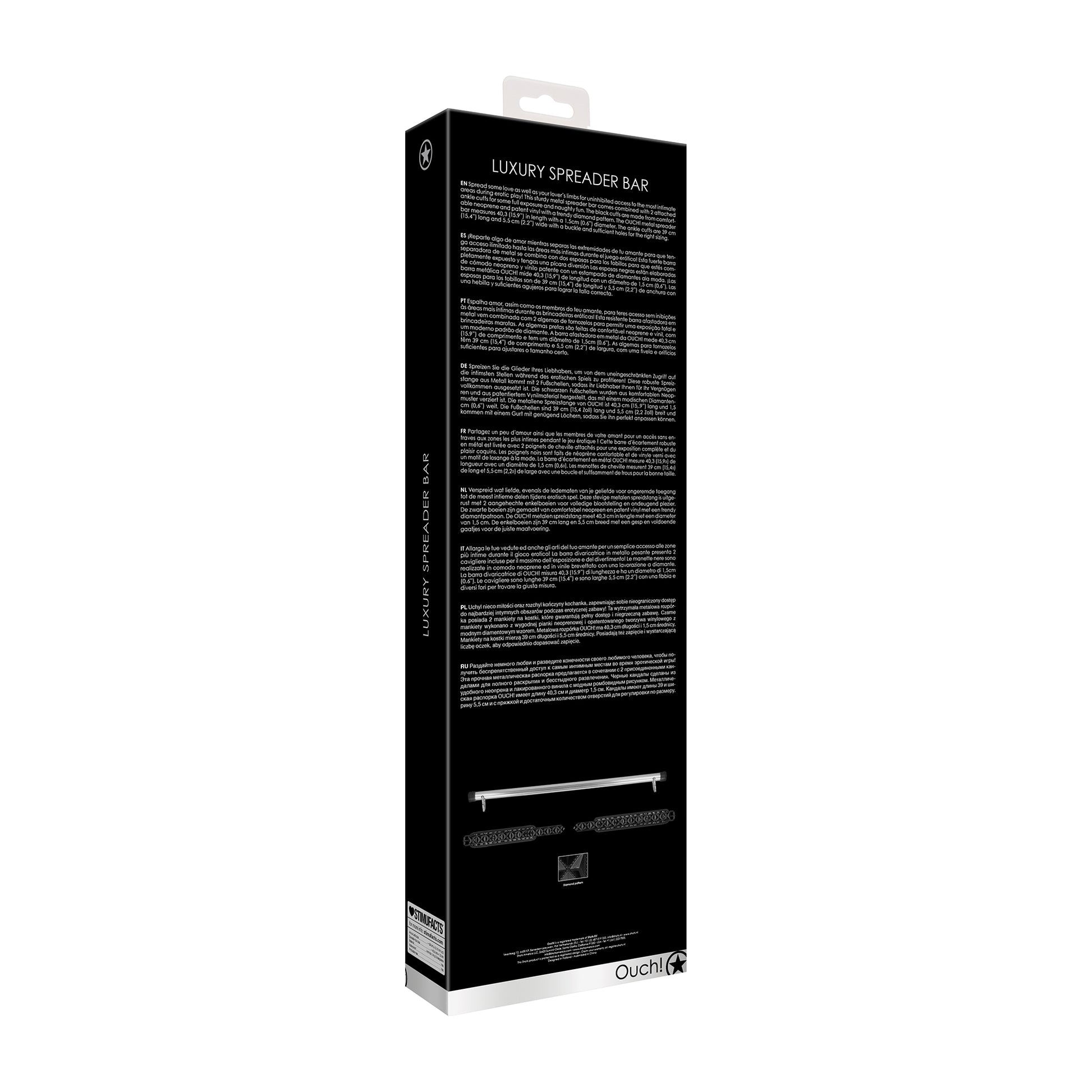Espalhe um pouco de amor e também os membros do seu amante para ter acesso desimpedido às áreas mais íntimas durante os jogos eróticos! Esta barra afastadora de metal resistente vem combinada com 2 algemas de tornozelos para alguma exposição total e diversão marota. As algemas pretas são feitas em neopreno confortável e vinil patenteado com um moderno padrão de diamante. A barra afastadora de metal OUCH! mede 40,3 de comprimento e 1,5cm de diâmetro. As algemas têm 39 cm de comprimento e 5,5 cm de largura, com fivela e orifícios suficientes para ajustar ao tamanho certo.