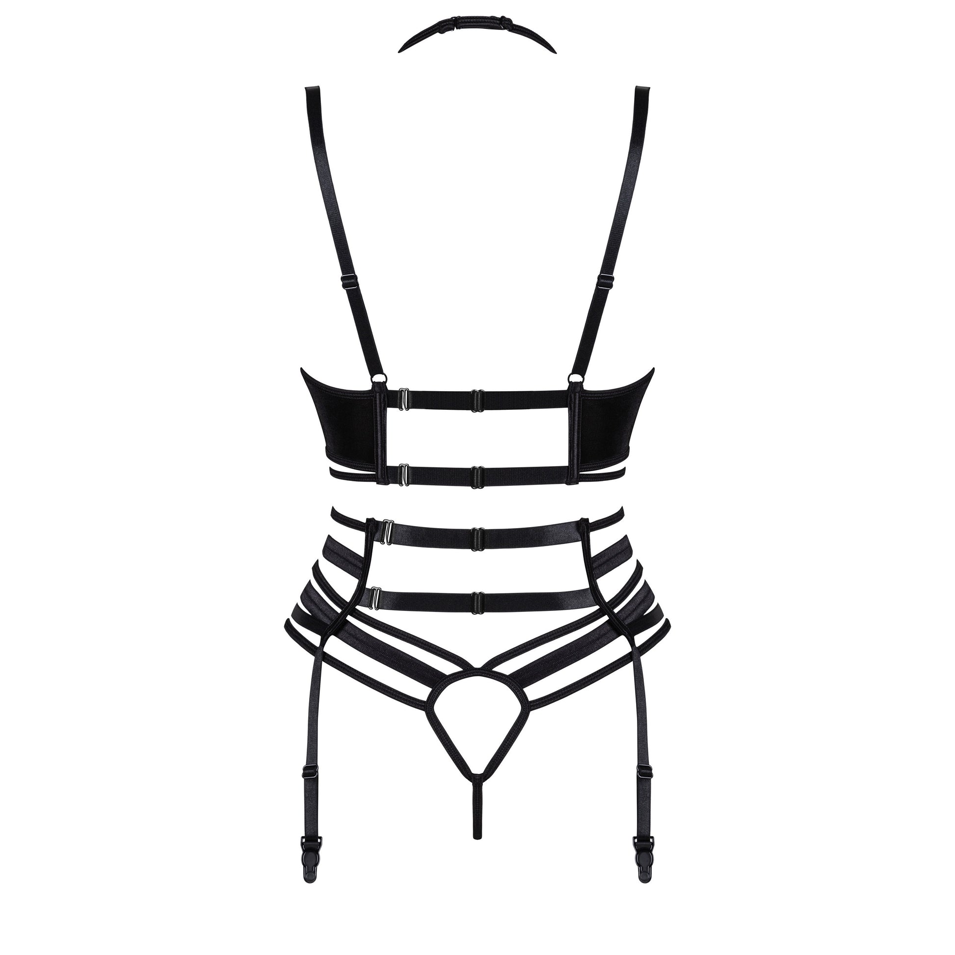 O conjunto Joanna combina elegância e sensualidade, fazendo com que cada mulher se sinta especial. Feito com bordados florais coloridos e material elástico e brilhante, o conjunto inclui um sutiã, um cinto de ligas e uma tanga.