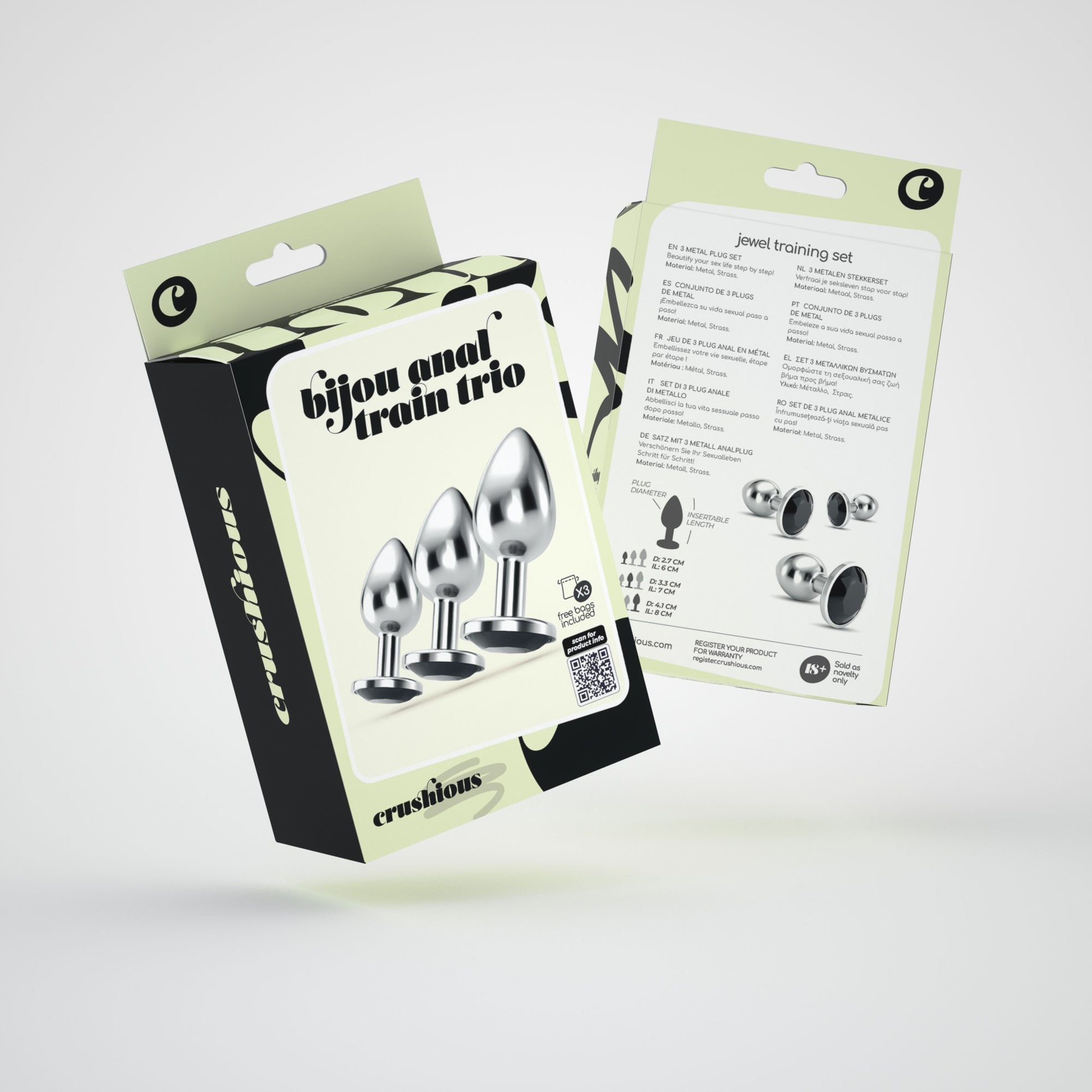 Entregue-se da forma mais luxuosa! Crushious apresenta a coleção de joias anais mais cobiçadas e elegantes. Bijou traz até si plugs anais sofisticados, apresentados num conjunto de 3 tamanhos diferentes para ir aumentando a sua resistência gradualmente.